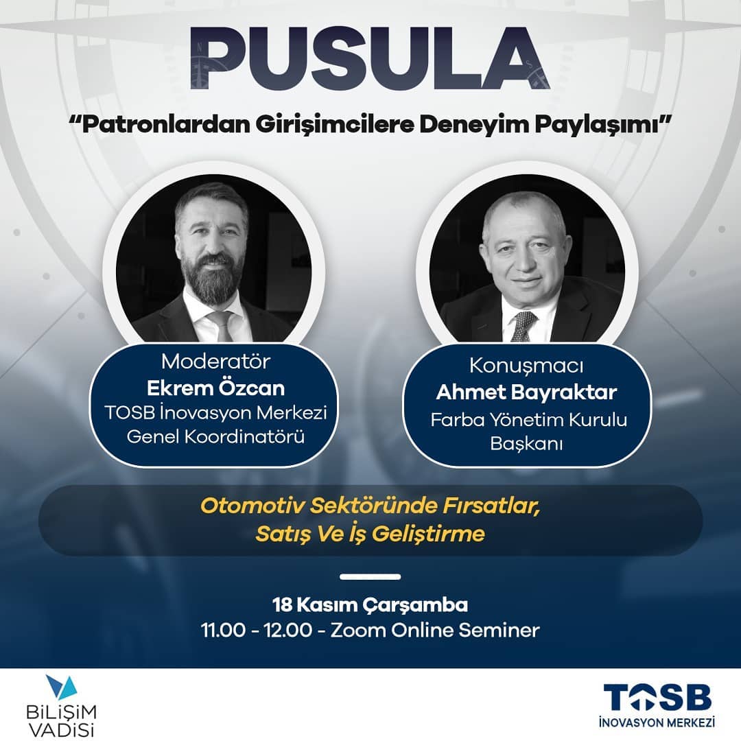 TOSB İnovasyon Merkezi koordinasyonunda Bilişim Vadisi’ nin katkılarıyla düzenlenen 'Patronlardan Girişimcilere Deneyim Paylaşımı' Pusula Programı’nın yeni konuğu FARBA Yönetim Kurulu Başkanı – Ahmet BAYRAKTAR.