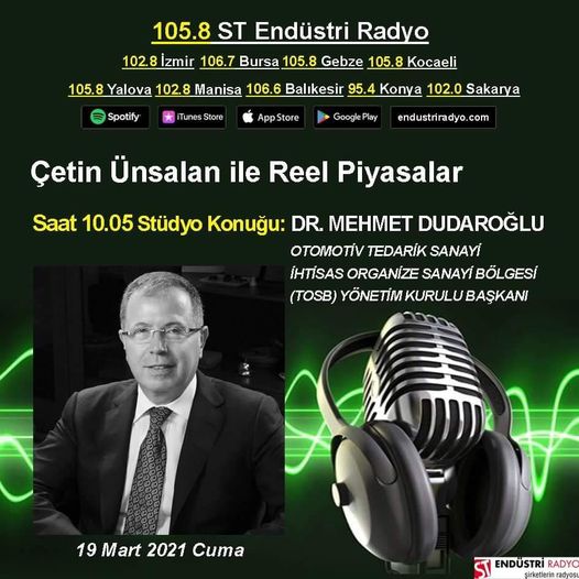 Yönetim Kurulu Başkanımız Dr. Mehmet Dudaroğlu, yarın saat 10.05’te ST Endüstri Radyo’nun konuğu olacak.